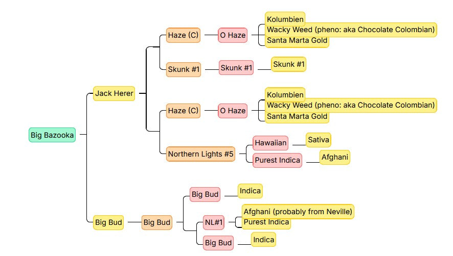 Big Bazooka ist eine reine Indica-Sorte von Anesia Seeds mit einem beeindruckenden THC-Gehalt von bis zu 29%. Sie kombiniert die ertragreiche Genetik von Big Bud mit der legendären Wirkung von Jack Herer. Das Ergebnis: ein stark entspannendes Körper-High mit sofortigem Couch-Lock, während der Geist angenehm aktiv bleibt.