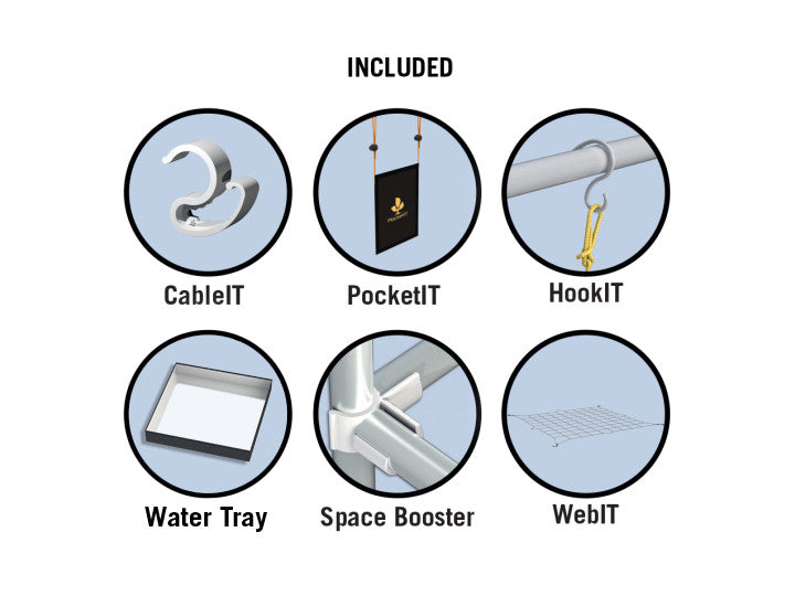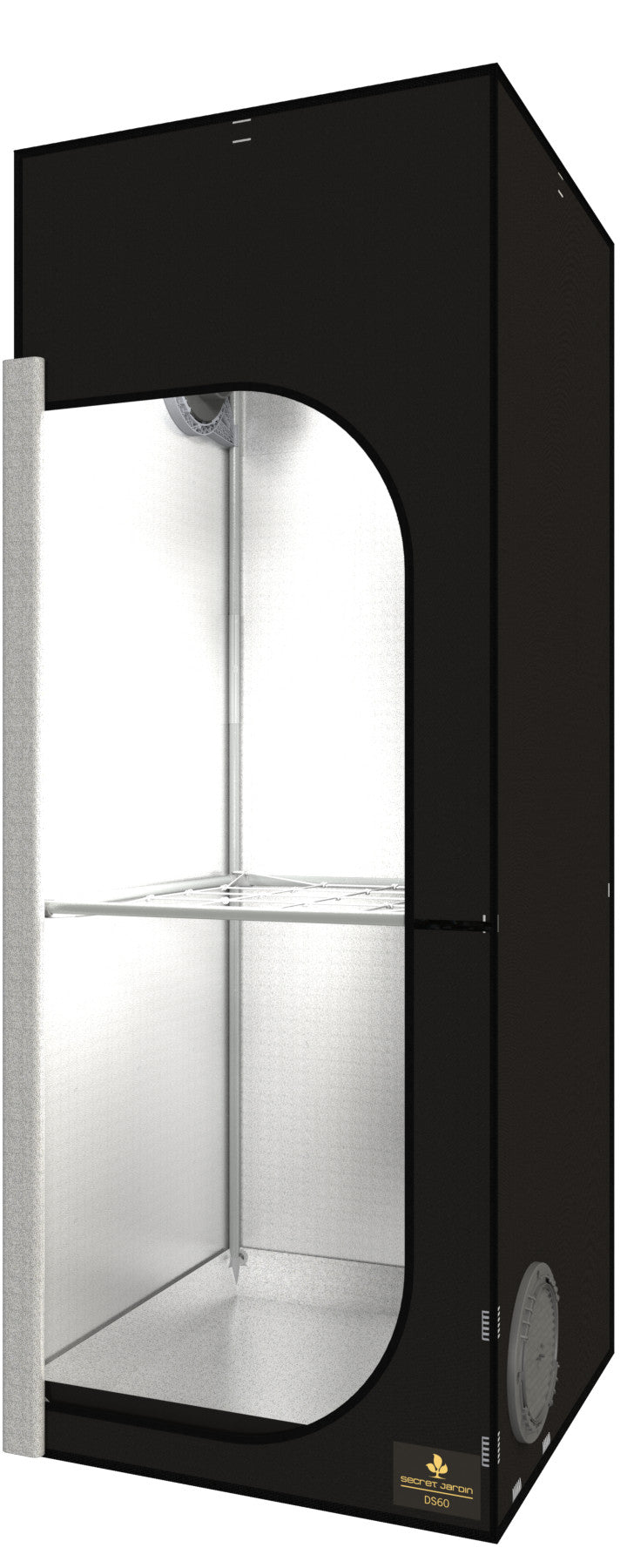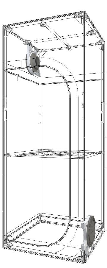Maße: 60 x 60 x 158 cm. Geeignet für den mittleren Bereich im Pflanzenanbau mit robuster Verarbeitung und durchdachter Ausstattung. Die Öffnungen für Belüftung oder Kabel können flexibel angepasst werden. Enthaltenes Zubehör: zwei Halterungen, ein Verbinder mit 100 mm Durchmesser, eine Lichtfalle, eine Kabeldurchführung, ein Abstandshalter zur Stabilisierung, eine wasserdichte Einlage, ein Haken zum Aufhängen von Beleuchtung, 15 Klammern zur Kabelführung sowie eine Tasche zur Aufbewahrung von Werkzeug oder Messgeräten. Gefertigt aus reflektierendem Mylar 210D und 16 mm Stahlrohrrahmen. Geeignete Beleuchtung: 250W Natriumdampflampe oder 200W LED. Empfohlene Abluftleistung: 75 m³/h bei Natriumdampflampe, 35 m³/h bei LED. Eigengewicht 6,7 kg.