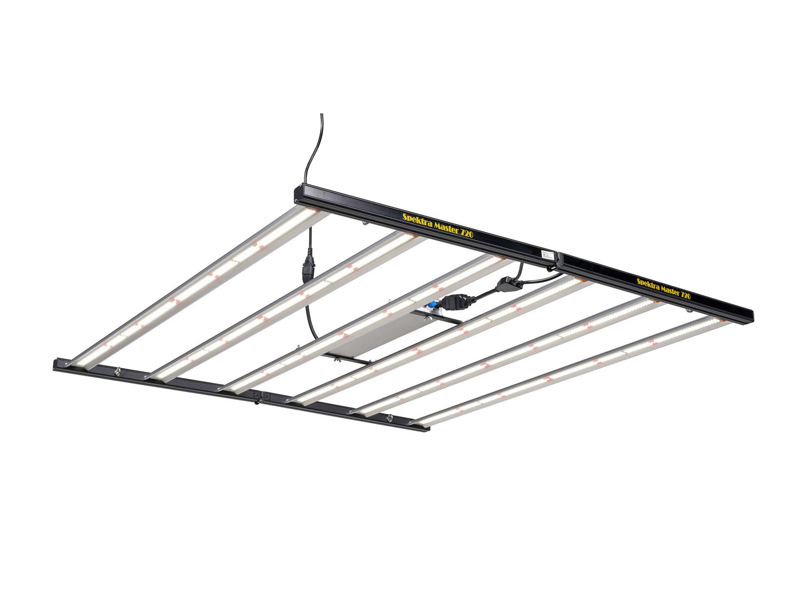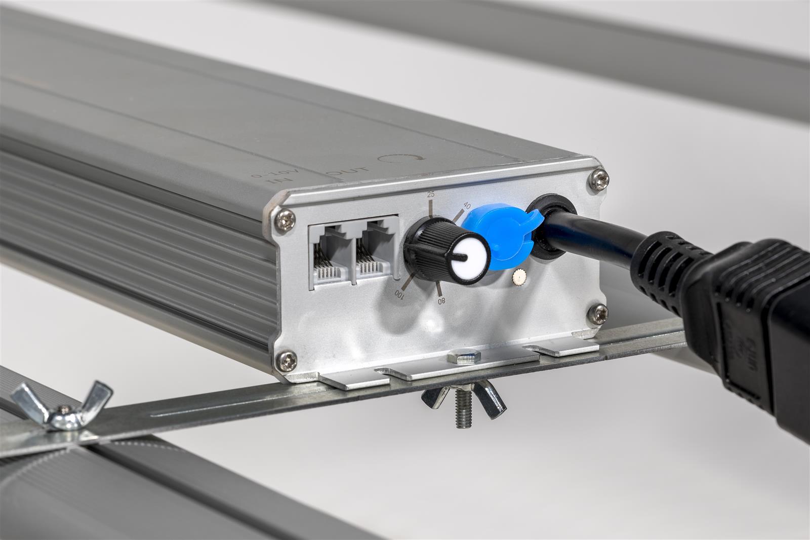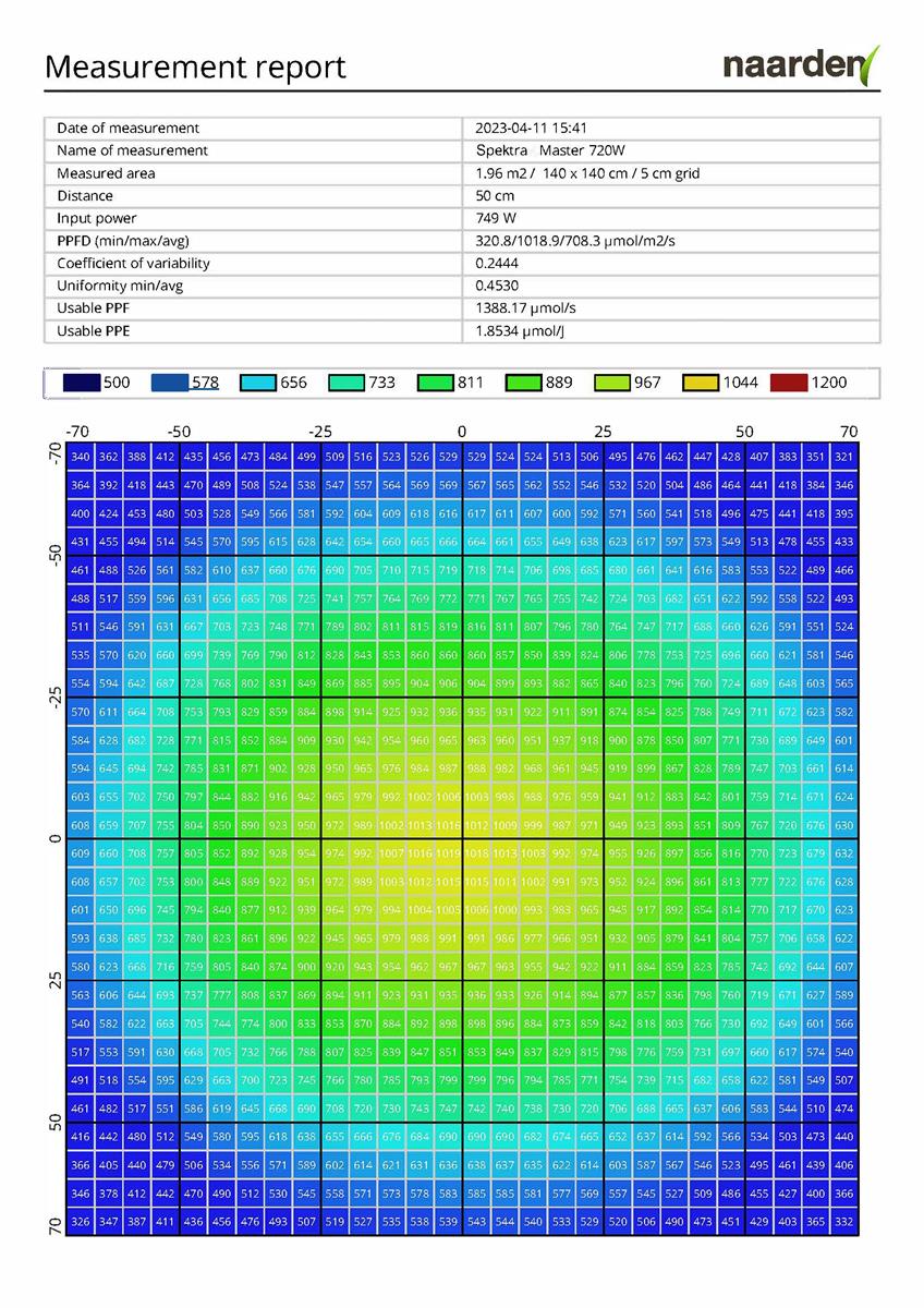 Für eine Anbaufläche bis zu 150 x 150 cm geeignet. Effizienz liegt bei 2,8 Mikromol pro Joule, PPF beträgt 2016 Mikromol pro Sekunde. Leistung maximal 720 Watt, Stromaufnahme 3,13 Ampere bei 220 Volt. Eingangsspannung zwischen 100 und 277 Volt. Manuelle Dimmung über das Netzteil in fünf Stufen: 25, 40, 60, 80 und 100 Prozent. Zusätzlich dimmbar über externen Controller mit 0 bis 10 Volt Signal. Kühlkörper sind zugleich als Reflektoren gestaltet. Abstrahlwinkel liegt bei 120 Grad. Maße betragen 119,5 mal 110,8 Zentimeter. Schutzklasse IP66, Lebensdauer bei L90 über 54000 Stunden.