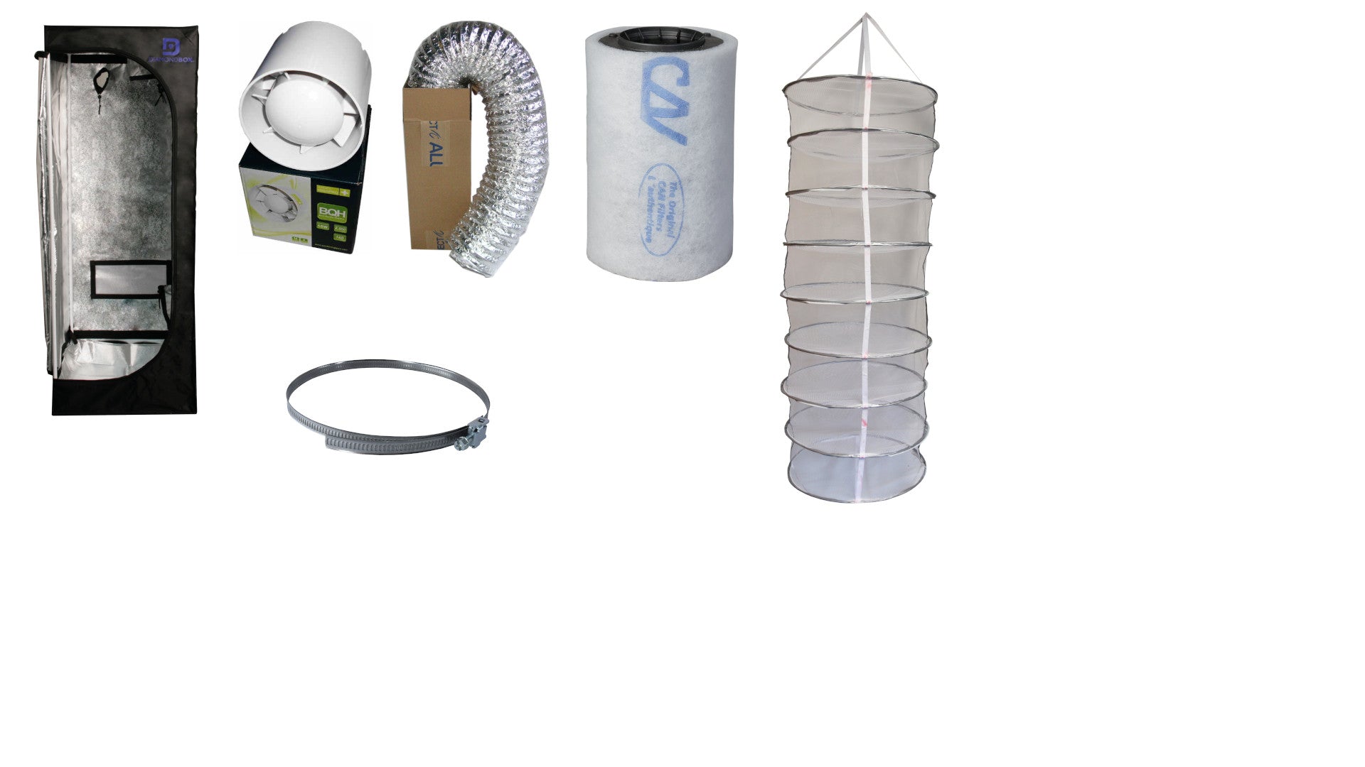 Gegen unerwünschte Gerüche ist im Set ein Aktivkohlefilter von Can enthalten, der mit einem kurzen Stück Aluflexrohr mit einem GHP Rohrventilator betrieben wird.